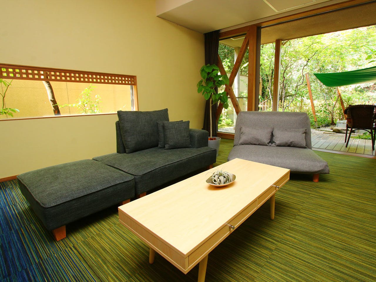 全室にテラスがついており、そこでのんびりと過ごしながら、竹と水が織りなす癒しの時を感じ取ってください。