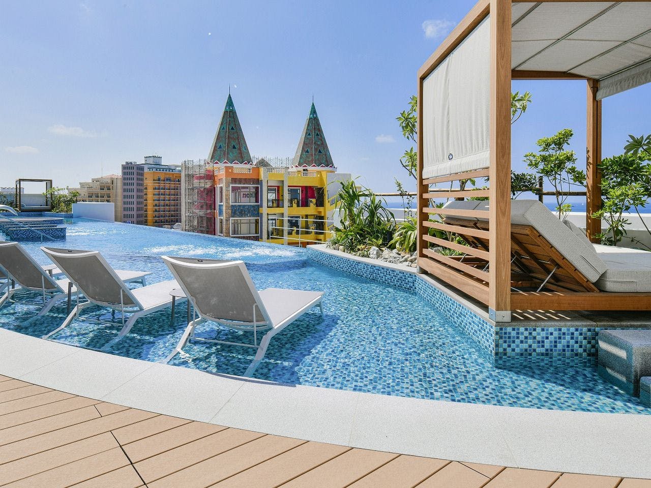 また、最上階の8階にはSNS映えするインフィニティプールがあり、眺めは抜群!インフィニティプールから見えるアメリカンビレッジの街並みとあいまって、最高の映えフォトが撮れますよ。
