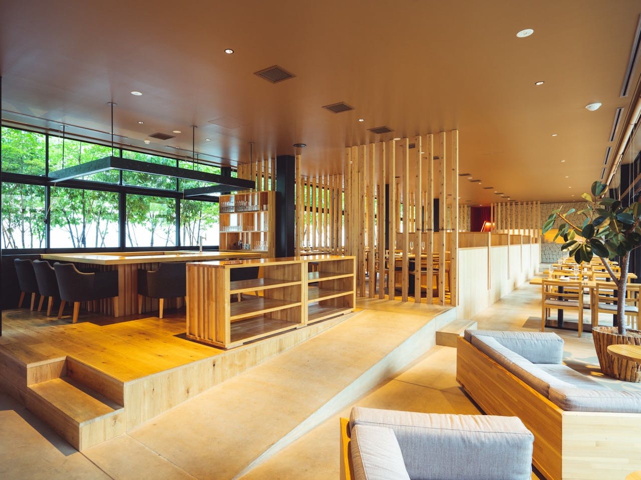 出典:宿泊者専用ラウンジは吉野杉の温かみが感じられ、中庭にある枝垂れ桜を眺めたり、心地よく吹き抜ける風を感じたりと、思いのままに過ごせる寛げる空間。