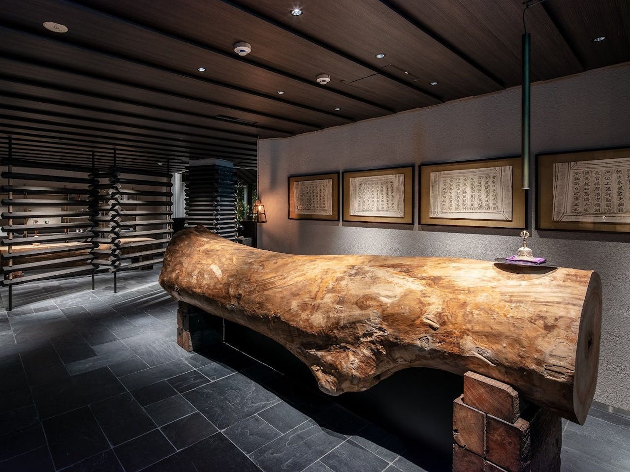 レセプションカウンターには、『ふふ奈良』が建った地にあった大木を切り出したもので、見事に空間と調和しています。