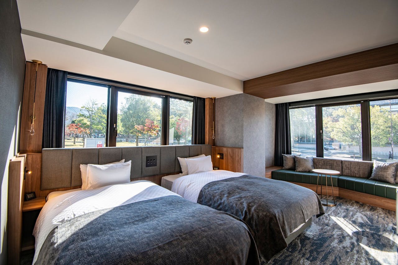 出典:チェックインを済ませ、お部屋に入るとシックな色合いでまとめられた広々とした空間が広がり、お部屋によっては奈良公園の鹿が見えるなんてことも!