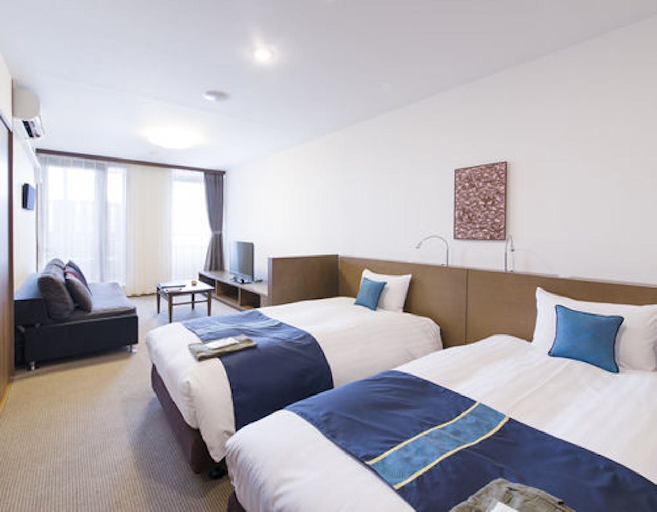 お楽しみのお部屋は、白を基調に英虞湾を連想させる鮮やかなターコイズブルーがポイントカラーで使われた、可愛らしいしつらえとなっています。