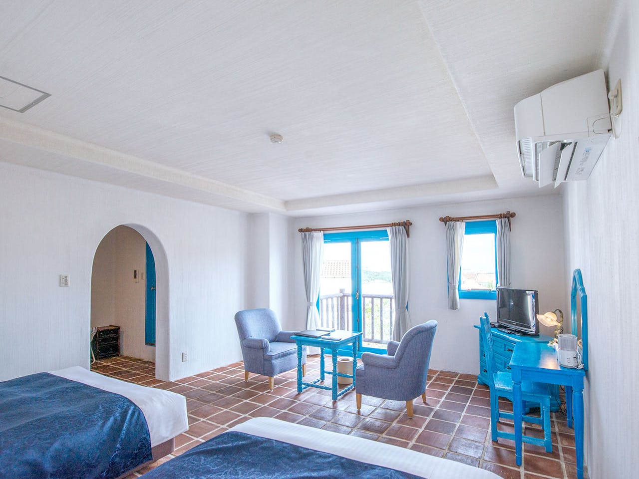 客室は素朴なアンダルシア地方の民家をイメージし、美しいターコイズブルーとテラスから見える海とのコントラストが最高の眺めを作り出しています。